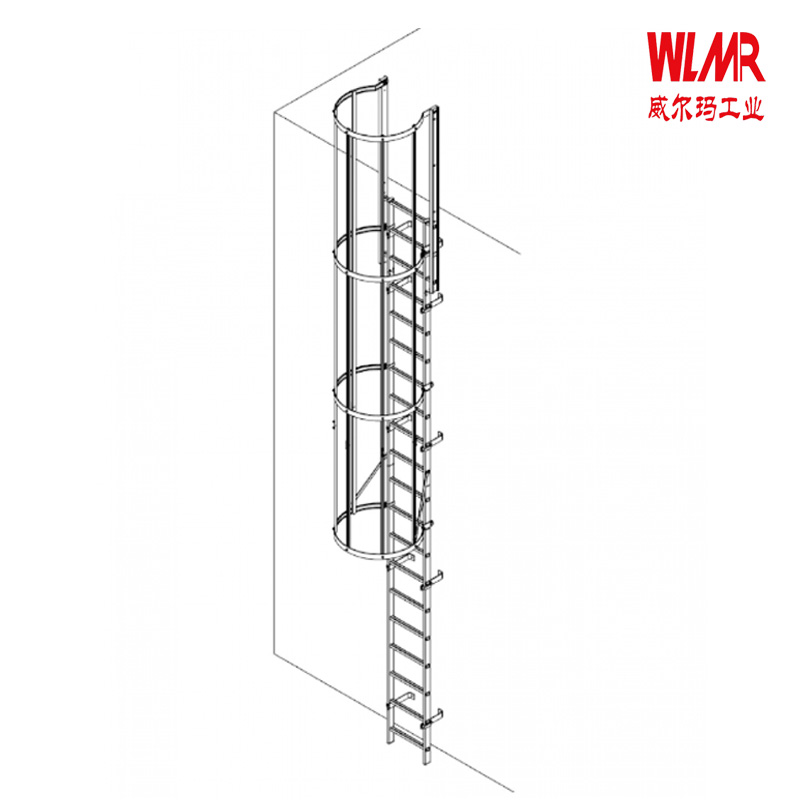 Estruturalmente, a escada é fabricada em aço estrutural resistente ao fogo e de espessura grossa em um sistema de degraus emparelhado com uma gaiola de segurança fechada de altura total (com anéis de reforço circulares para estabilidade). Possui um revestimento protetor resistente às intempéries (normalmente tinta galvanizada ou resistente ao calor) para proteger contra ferrugem e desgaste térmico. Os suportes de montagem pré-soldados permitem uma ancoragem segura no exterior do edifício, com juntas reforçadas para lidar com cargas dinâmicas de emergência. O espaçamento dos degraus segue padrões ergonômicos para uma escalada rápida e segura, e o design da gaiola garante proteção de 360° aos usuários. A escada estende-se verticalmente para corresponder à altura do edifício, com uma base estável ancorada ao solo para suporte estrutural.